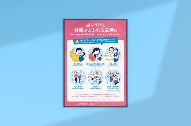 関西の空の玄関口となる関西三空港(関西国際空港・大阪国際空港・神戸空港)を運営し、利用者の利便性向上や地域の発展に取り組んでいる関西エアポート株式会社様のハラスメント啓発活動の一環としてのポスター制作に際し、ディレクションからイラスト描き起こし、グラフィックデザイン、翻訳、印刷までワンストップで担当。