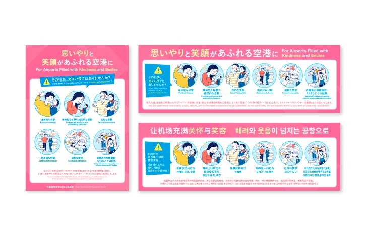 関西の空の玄関口となる関西三空港(関西国際空港・大阪国際空港・神戸空港)を運営し、利用者の利便性向上や地域の発展に取り組んでいる関西エアポート株式会社様のハラスメント啓発活動の一環としてのポスター制作に際し、ディレクションからイラスト描き起こし、グラフィックデザイン、翻訳、印刷までワンストップで担当。