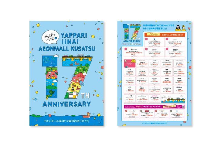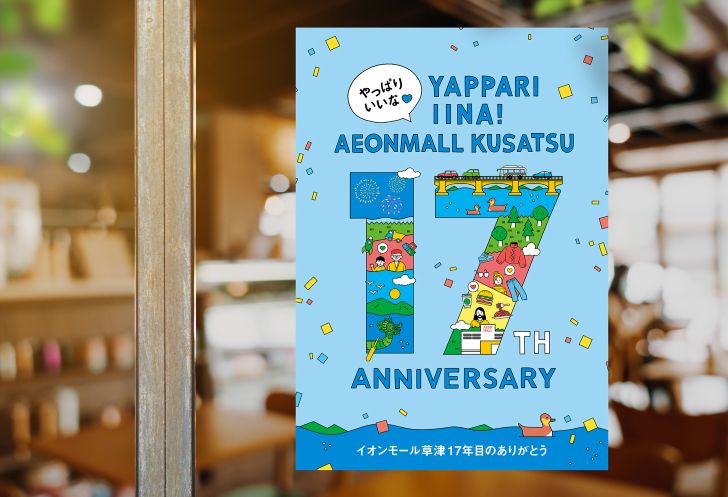 琵琶湖のほとりに広がり湖畔の風を感じながらいつもの日常を少し特別にしてくれるイオンモール草津様の17周年祭に際し、キービジュアルのディレクションからグラフィックデザインを担当。
